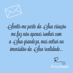 O Senhor nos cria e nos permite criar quando nos reveste com o Seu poder. Sentir-me parte da Sua criação me faz não apenas sonhar com a Sua grandeza, mas entrar na imensidão da Sua realidade… é nela onde eu quero viver.